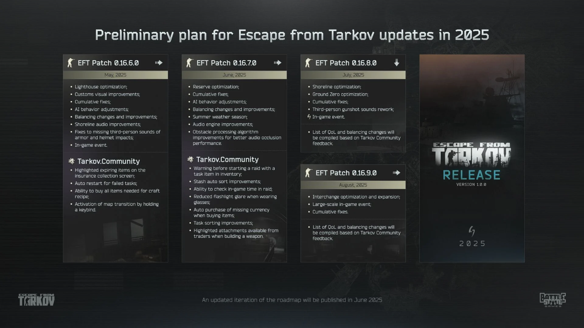 Şimdi hem Escape from Tarkov hem de Tarkov Arena sonunda ufukta 1.0 sürümüne sahip. Ancak hala kesin bir tarihimiz yok, hatta belirli bir ay bile yok. Elimizde Mayıs’tan Ağustos 2025’e kadar her ay yeni yamalar vaat eden bir yol haritası var.