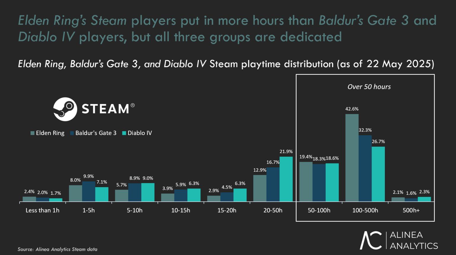 Konuyu daha da ilginç hale getirmek için, Alinea Analytics, Elden Ring oyuncularının Steam’deki katılımını iki dev yapımla karşılaştırdı: Baldur’s Gate 3 ve Diablo 4. Aşağıdaki grafikte de açıkça görüldüğü gibi, bu üç oyun da hayatımızdan yüzlerce saat çalmaya aday.