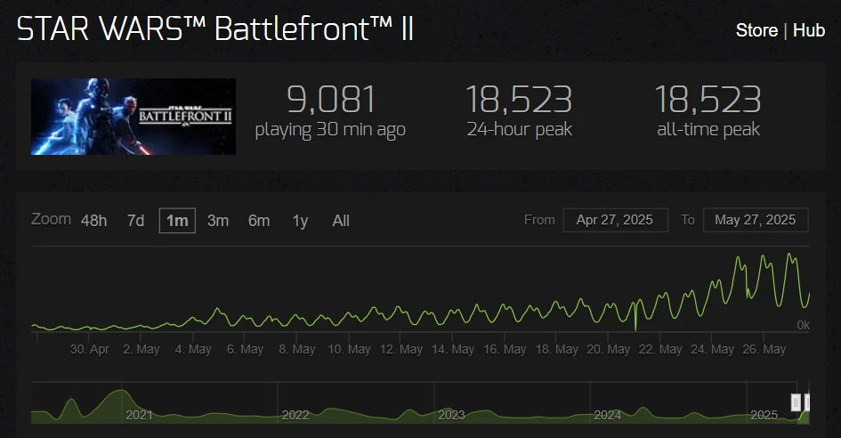 Öncelikle, Disney+ platformunda yayınlanan ve Rogue One: Bir Star Wars Hikayesi filmindeki olaylardan önce Cassian Andor’un hayatına odaklanan Andor dizisi, ikinci ve final sezonunu büyük başarı tamamladı. SteamDB grafiği incelendiğinde, Battlefront 2’nin oyuncu sayısının Andor 2. Sezon’un yayınlanmasından sadece birkaç hafta sonra yükselişe geçtiği açıkça görülüyor.