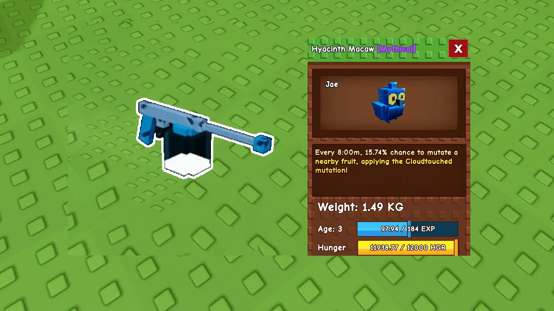 Elde edildikten sonra, bu Grow a Garden evcil hayvanının her 8 dakikada bir yakındaki bir meyveyi Cloudtouched ile mutasyona uğratma olasılığı %15,63’tür. Açlığı 12000, bu yüzden onu yaşlandırmak için beslemeye devam etmeniz gerekecek.