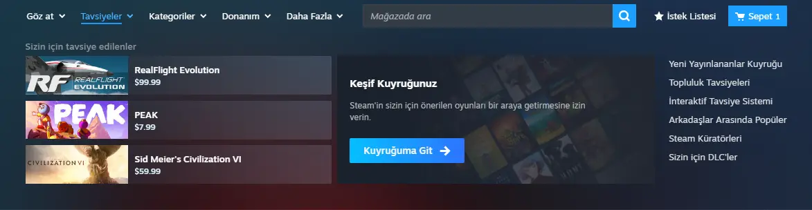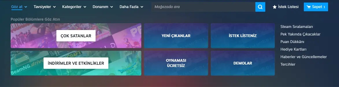 Arama çubuğunun hemen yanında yeni bir İstek Listesi kategorisi belirmiş! Kaç oyun eklediğimizi (merak ediyorsanız 34 tane!) gösterip bizi direkt İstek Listemize ışınlıyor. Menü çubuğundaki diğer seçenekler ise Keşfet, Tavsiyeler, Kategoriler, Donanım, Oynama Yolları ve Daha Fazlası gibi açılır menülerle her şeyi derleyip toparlamış.