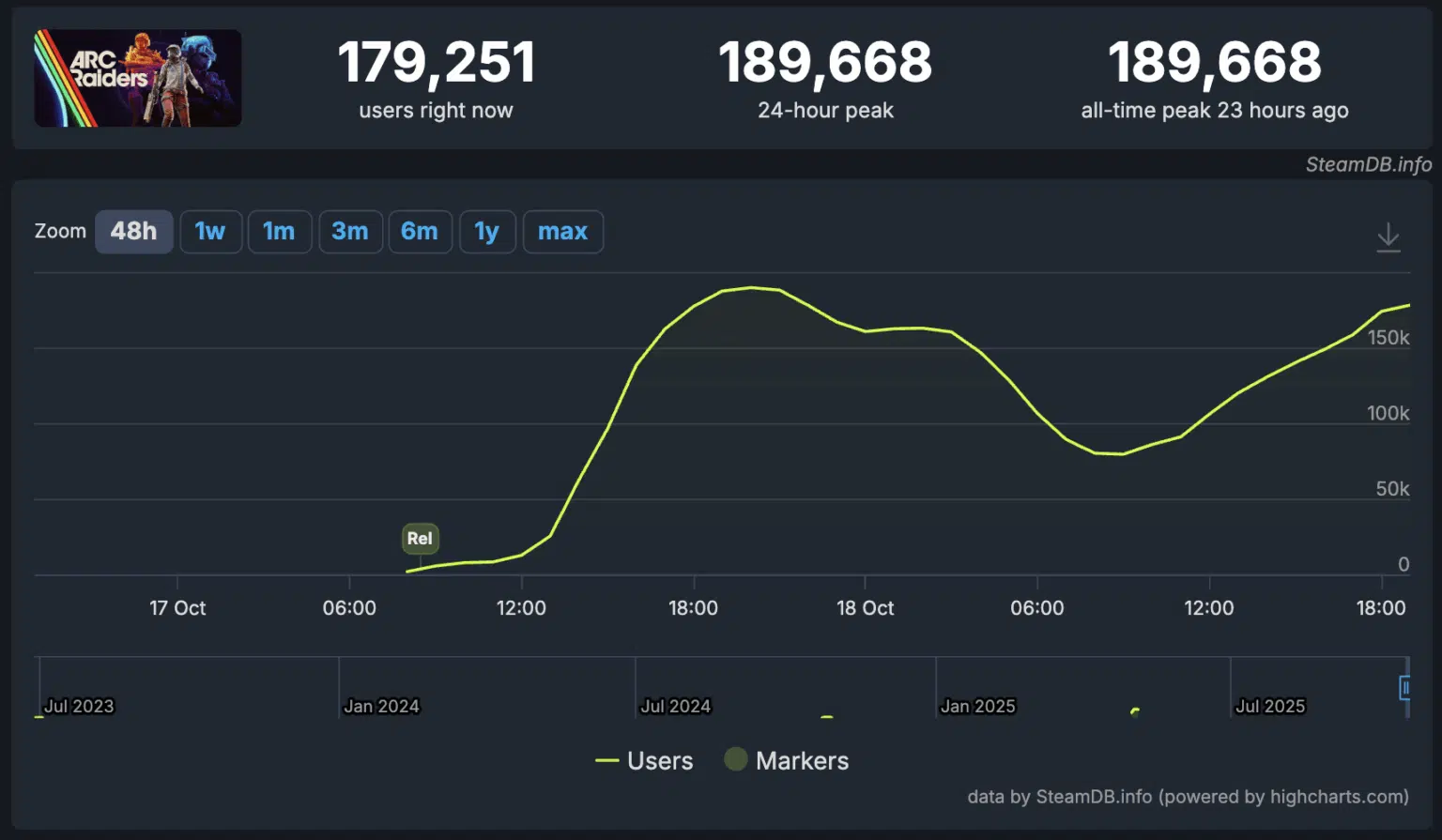 Yayınlandıktan sadece birkaç saat sonra, ARC Raiders tam 189.668 eş zamanlı oyuncuya ulaştı! Steam’in hafta sonu kullanımının zirveye çıktığı düşünülürse, bu sayının daha da artması bekleniyor. Özellikle de Battlefield 6 gibi çok başarılı bir oyunun çıkışına yakın bir zamanda böylesine etkileyici bir sonuç elde etmesi takdire şayan.