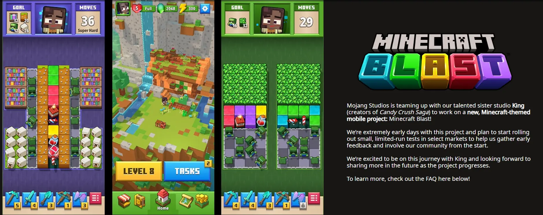 Mojang’ın ikonik Minecraft serisi, mobil cihazlar için yepyeni bir spin-off ile genişliyor. İsveçli stüdyo, iOS ve Android platformları için geliştirilen Minecraft Blast üzerinde match-3 ustası King ile güçlerini birleştirdi.