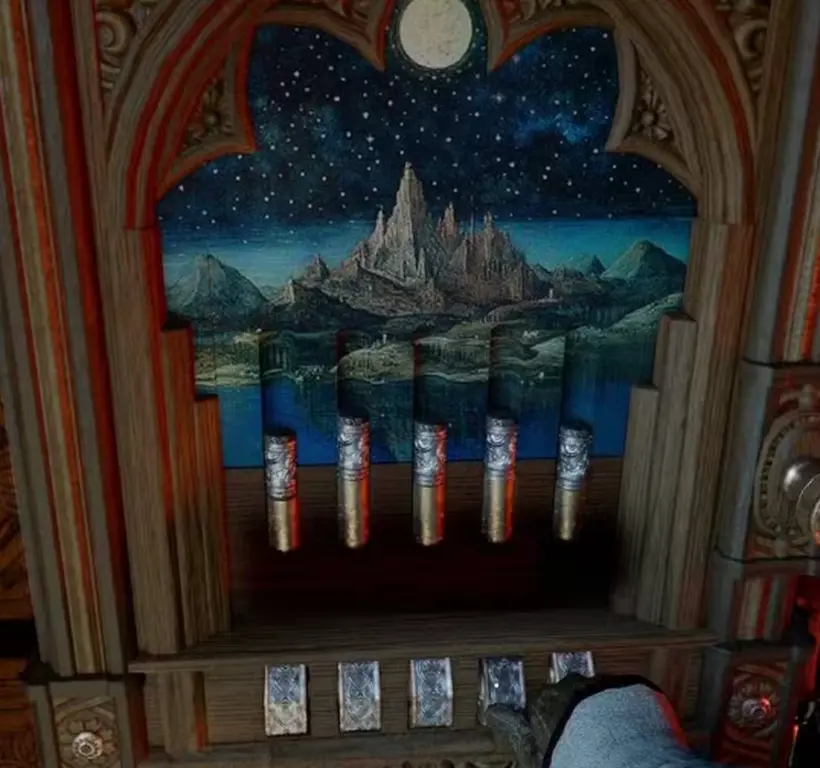 Kasanın üzerinde bir gece gökyüzü ve dağ sırası tasviri yer alıyor. Bu görselin altında gümüş ve bronz renkli beş adet silindir ve bunların altında da döndürülebilen tekerlekler bulunuyor. Amacınız, tekerlekleri doğru miktarda çevirerek silindirlerdeki orta çizgiyi, sanat eseri ile ahşap panel arasındaki sınır çizgisiyle hizalamak.